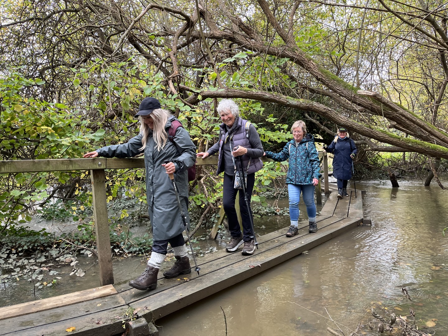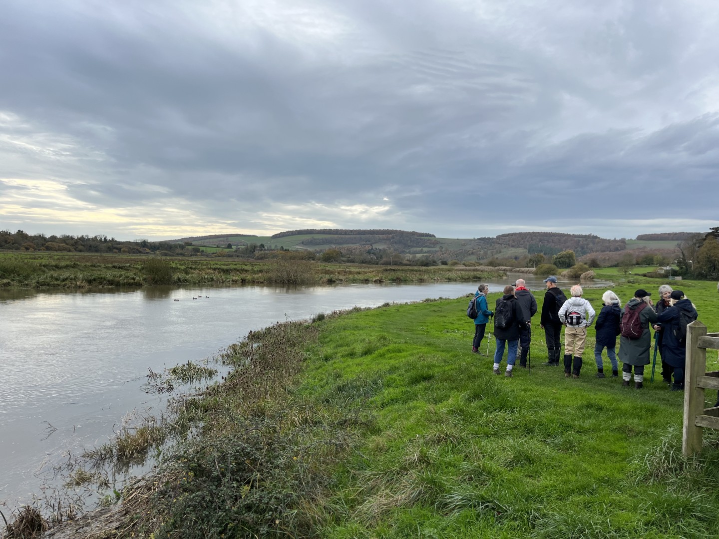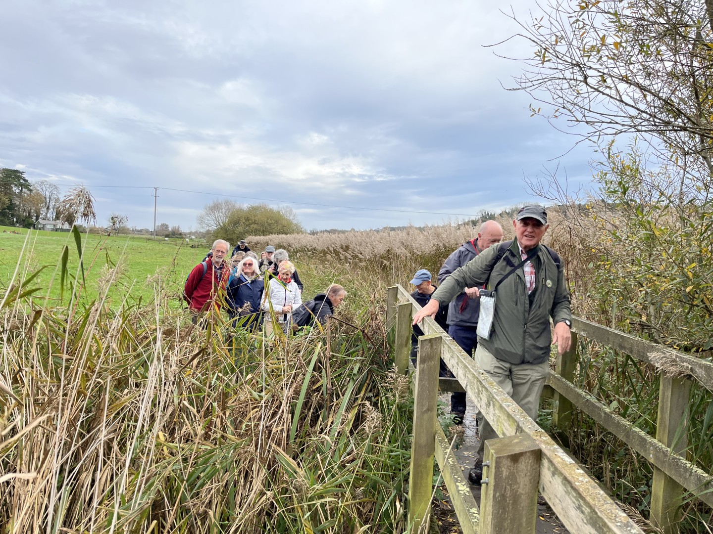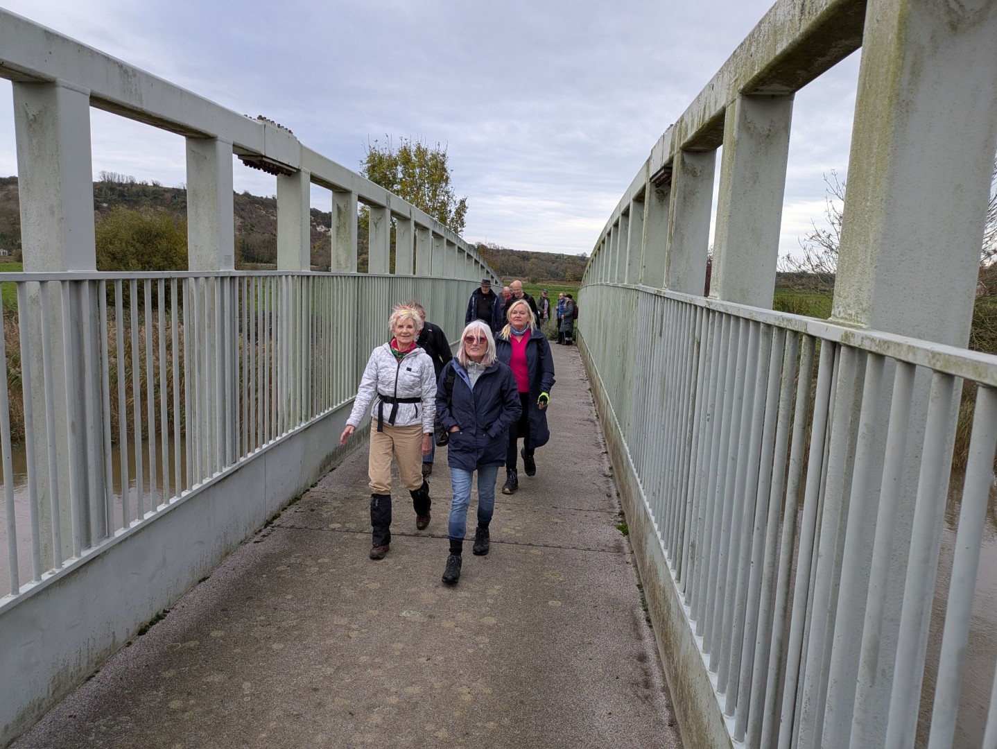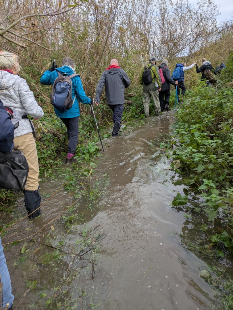 John had planned a 4 mile walk and warned us that the recent rain may make a couple of sections of the walk a bit muddy. Gathering in the car park of The Bridge Inn, a small number wore wellington boots and the majority were in walking boots. Setting off in the dry, balmy but overcast weather we crossed the old bridge at Houghton, pausing briefly to watch the fast incoming tide of the River Arun, and through the gate into a field to walk the path on the west bank. When we reached the first stile, it was wet underfoot with the river lapping at the banks. On reaching the second stile, the bottom step was underwater necessitating large steps to stay dry. The path had boardwalks that kept us dry, although they were a bit slippery. We reached a point where the boardwalk was broken and floated away but the water level was too high to continue. We decided retreat was the better part of valour, but then discovered that the tide was still rising and our retreat path was substantially now under water. It did not take long to realise that those of us in walking boots had no option but to wade and get wet feet. Regrouping once we had gained higher ground, some returned to the Inn to clean up and dry out while a revised higher and shorter walk was planned and walked to all meet up again at the Bridge Inn, where we celebrated an eventful walk with an excellent lunch.