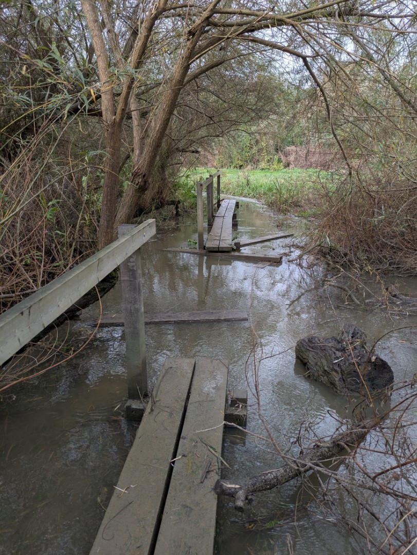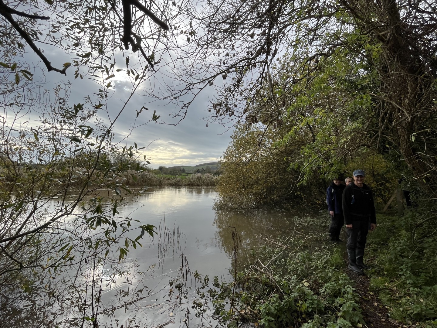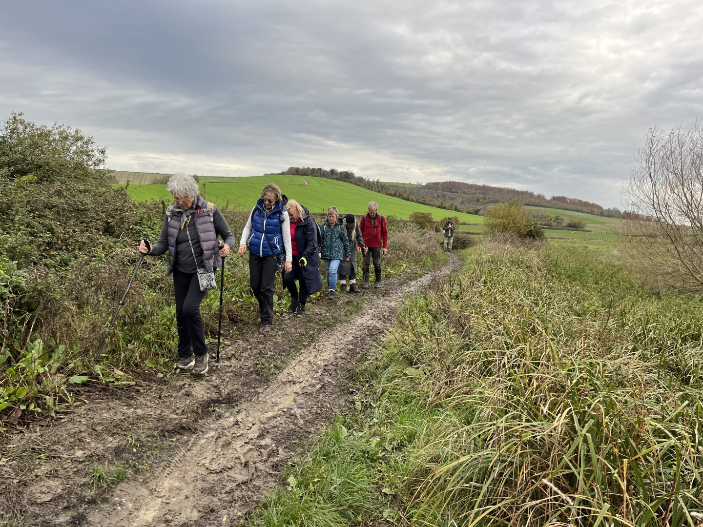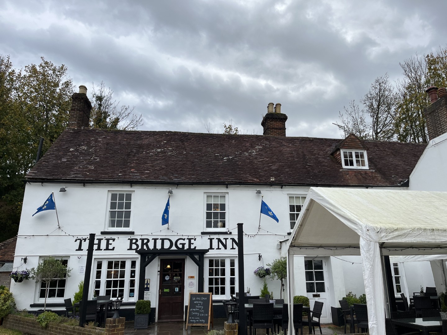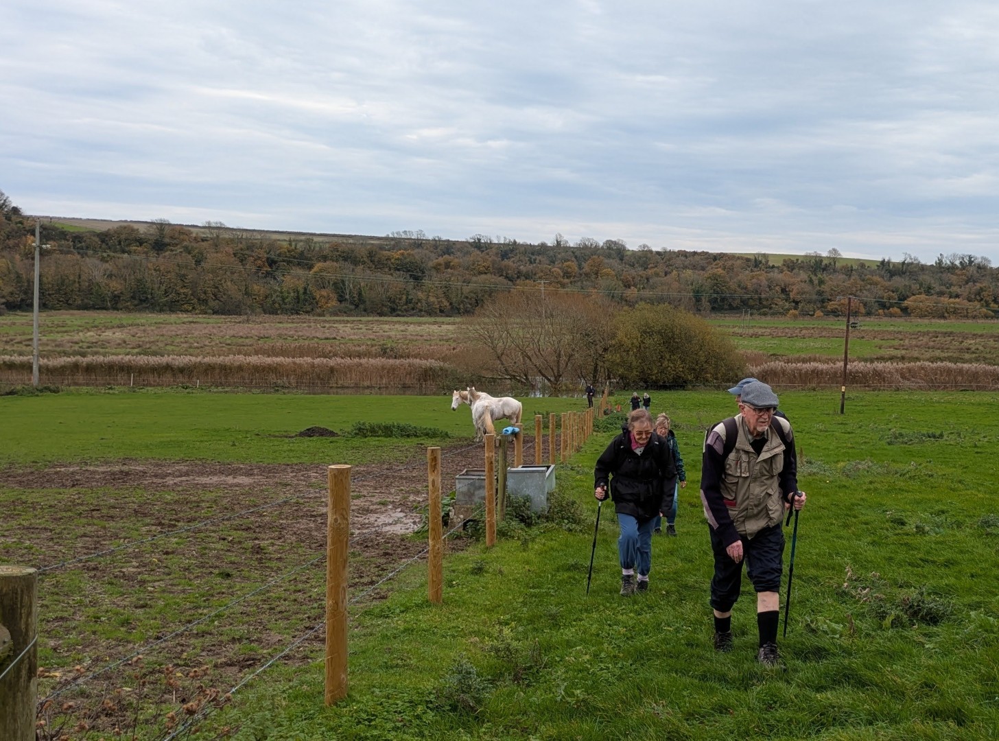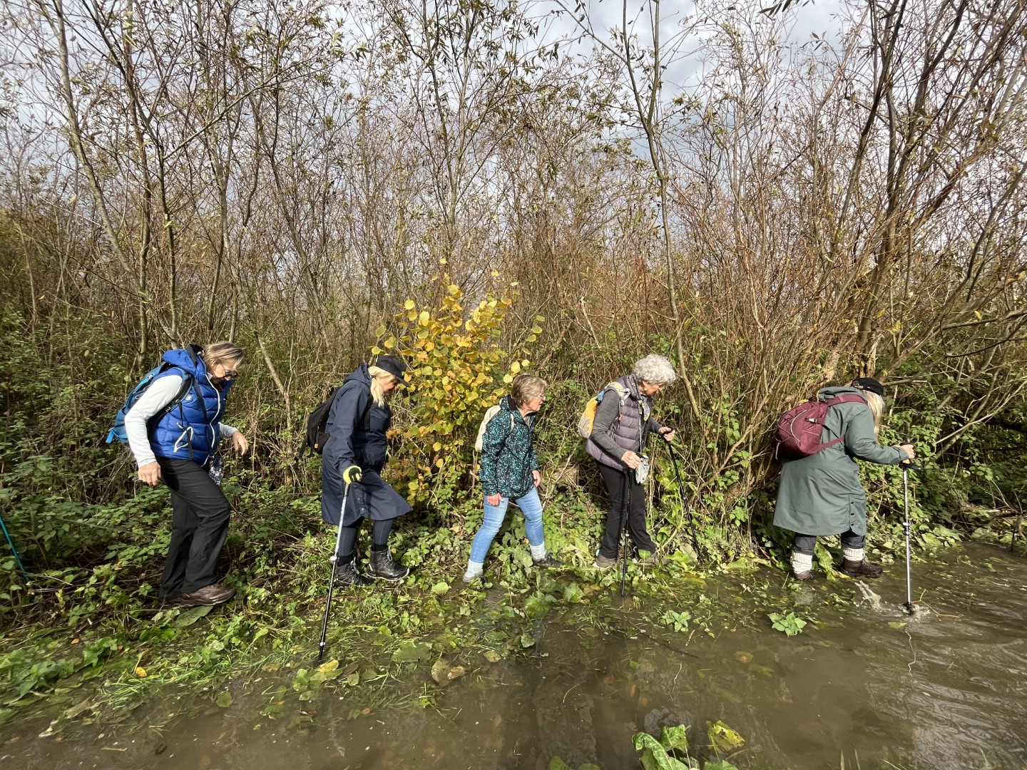 John had planned a 4 mile walk and warned us that the recent rain may make a couple of sections of the walk a bit muddy. Gathering in the car park of The Bridge Inn, a small number wore wellington boots and the majority were in walking boots. Setting off in the dry, balmy but overcast weather we crossed the old bridge at Houghton, pausing briefly to watch the fast incoming tide of the River Arun, and through the gate into a field to walk the path on the west bank. When we reached the first stile, it was wet underfoot with the river lapping at the banks. On reaching the second stile, the bottom step was underwater necessitating large steps to stay dry. The path had boardwalks that kept us dry, although they were a bit slippery. We reached a point where the boardwalk was broken and floated away but the water level was too high to continue. We decided retreat was the better part of valour, but then discovered that the tide was still rising and our retreat path was substantially now under water. It did not take long to realise that those of us in walking boots had no option but to wade and get wet feet. Regrouping once we had gained higher ground, some returned to the Inn to clean up and dry out while a revised higher and shorter walk was planned and walked to all meet up again at the Bridge Inn, where we celebrated an eventful walk with an excellent lunch.