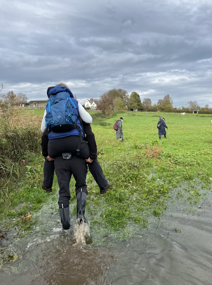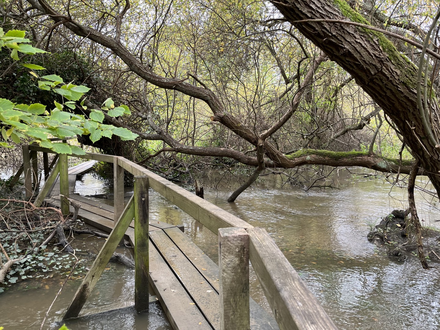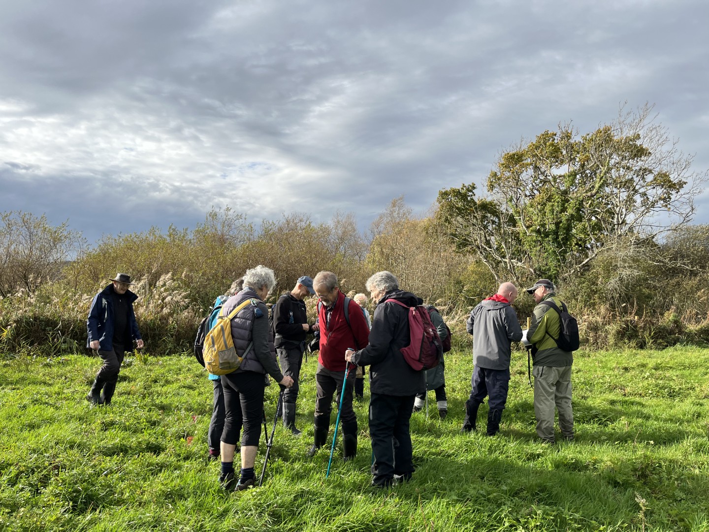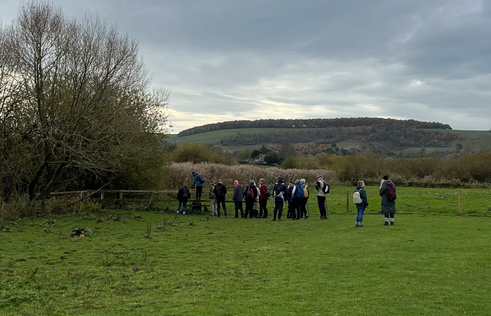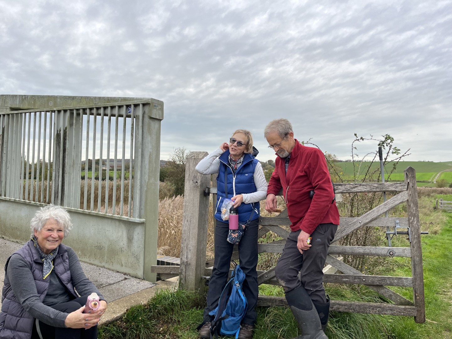 John had planned a 4 mile walk and warned us that the recent rain may make a couple of sections of the walk a bit muddy. Gathering in the car park of The Bridge Inn, a small number wore wellington boots and the majority were in walking boots. Setting off in the dry, balmy but overcast weather we crossed the old bridge at Houghton, pausing briefly to watch the fast incoming tide of the River Arun, and through the gate into a field to walk the path on the west bank. When we reached the first stile, it was wet underfoot with the river lapping at the banks. On reaching the second stile, the bottom step was underwater necessitating large steps to stay dry. The path had boardwalks that kept us dry, although they were a bit slippery. We reached a point where the boardwalk was broken and floated away but the water level was too high to continue. We decided retreat was the better part of valour, but then discovered that the tide was still rising and our retreat path was substantially now under water. It did not take long to realise that those of us in walking boots had no option but to wade and get wet feet. Regrouping once we had gained higher ground, some returned to the Inn to clean up and dry out while a revised higher and shorter walk was planned and walked to all meet up again at the Bridge Inn, where we celebrated an eventful walk with an excellent lunch.