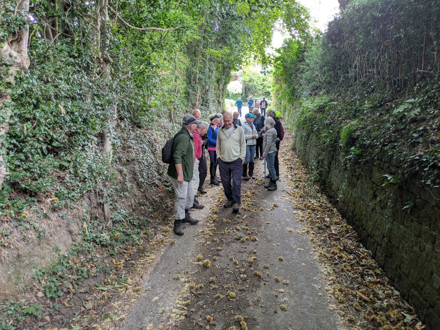 The walk led by Jay and Lindsey started from the road near the Tillington pub and headed south and east towards the cemetery. Not at all wishing to stop there, we headed north along the Sussex Diamond Way, passing through acres of vineyards, with grapes being harvested in the distance. We soon came to view the wonderful mansion called Pitshill. Building was complete by 1794 but the house was in poor condtion by 2010. After refurbishment, seven years later the building work was finished, including restoring the Shell House, a circular domed garden pleasure building allegedly decorated by the Mitford sisters, Frances, Emma and Caroline. The other sisters had remarkably political lives (Diana married Sir Oswald Mosley, Jessica, a communist who moved ot the U.S) so perhaps the shell decoration helped calm them down. See here :- Mitford family