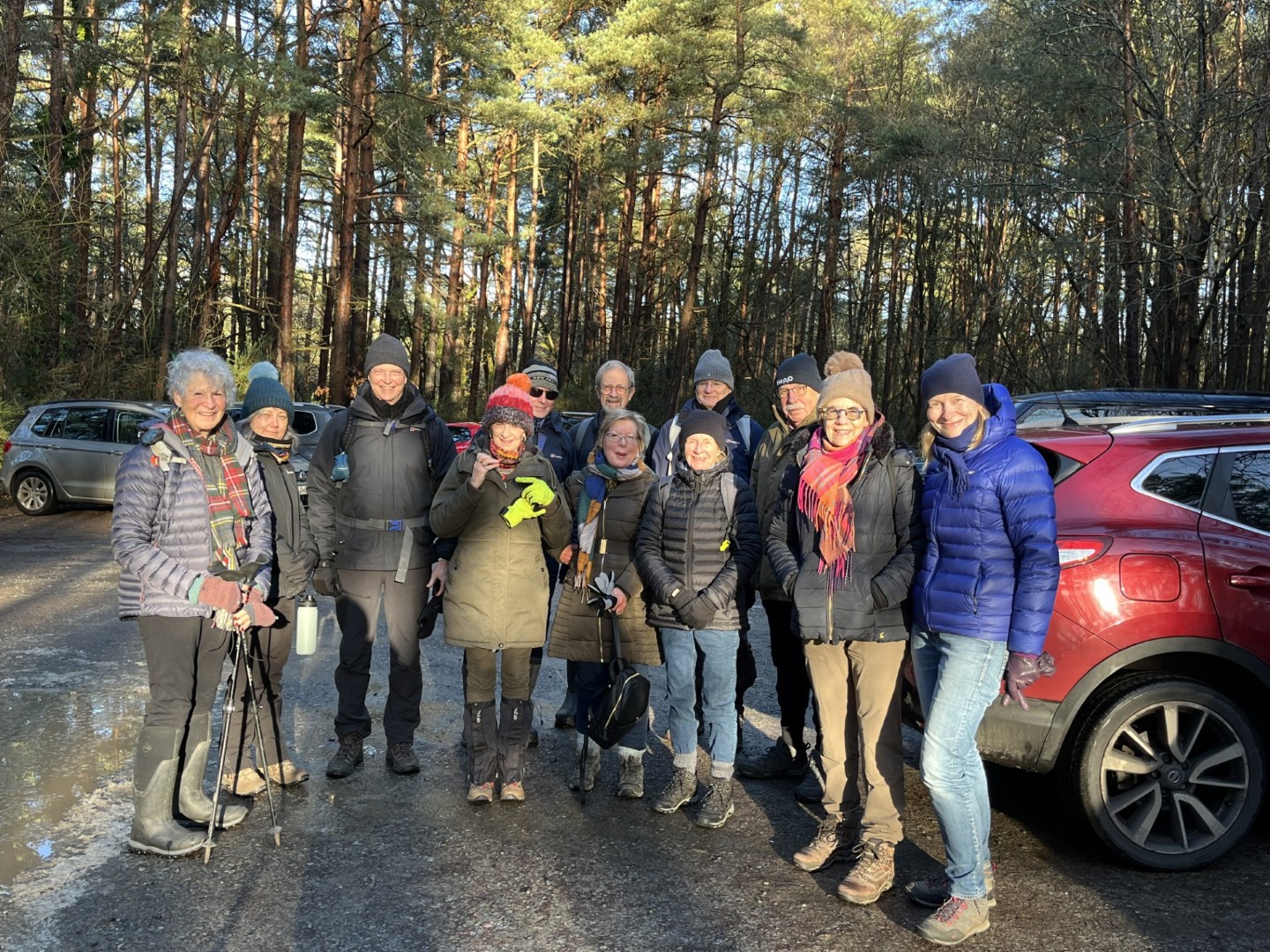 Our first group walk of the year assembled at the Moat Pond Car Park on Elstead Common for a 5 mile walk led by Jay and Lindsay. Because the terrain was flat and we made faster progress than normal, Jay added a detour at the end to make it 5.5 miles. The cloudless blue skies and sunshine had not been able to overcome the recent frosts so there were plenty of puddles to crunch the ice on and even a few ponds for the bravest amongst us to walk on. We walked alongside Pudmore Pond on the Elstead Common heath, through woodland up to Guinea Common where we turned east through more woodland and a pond crossing Royal Common reaching Bagmoor common. A perfectly placed felled tree trunk provided a suitable perch for our coffee break. Our rapid pace past Borough Farm and onto Okley Common allowed Jay to include the boardwalk on Thursley Common around Pudmore Pond. Returning to the car park, we changed and drove to The Three Horseshoes at Thursley for a delicious lunch.