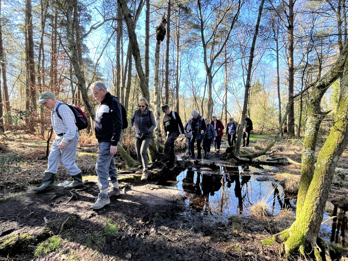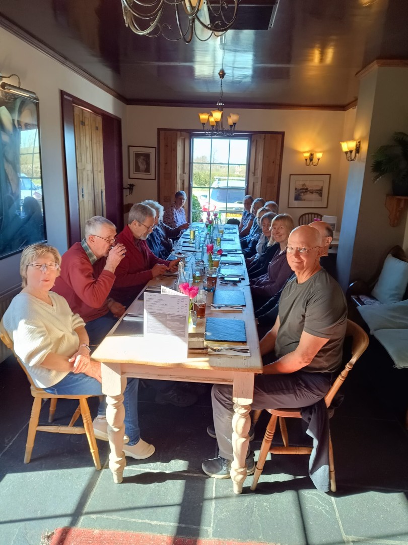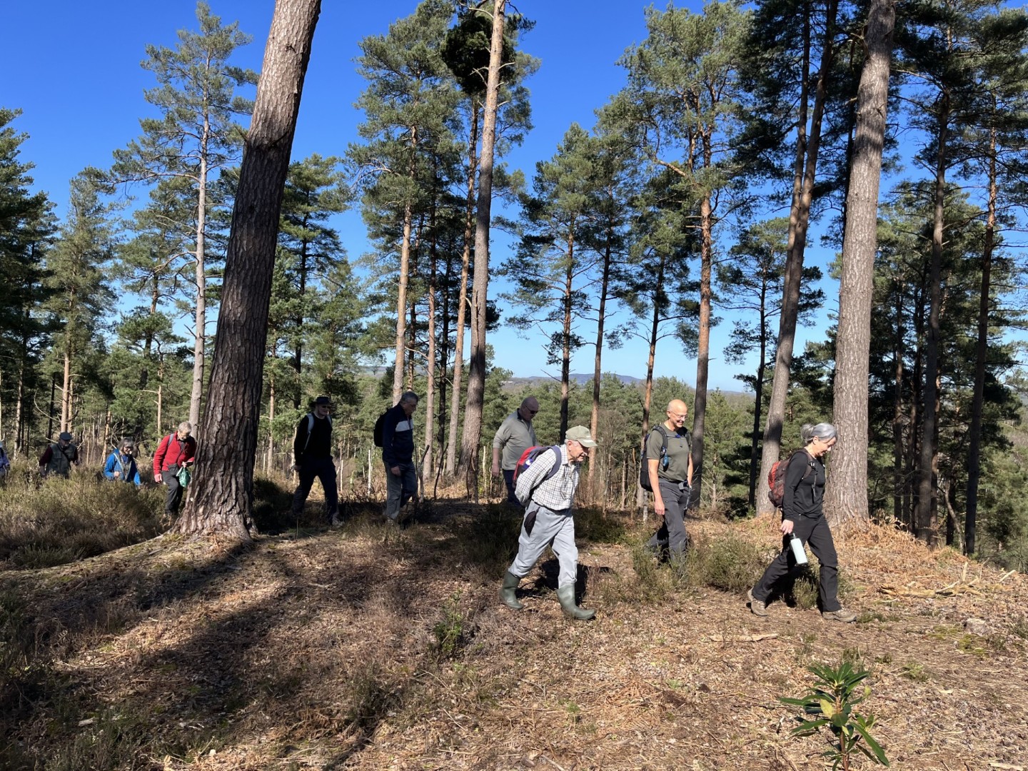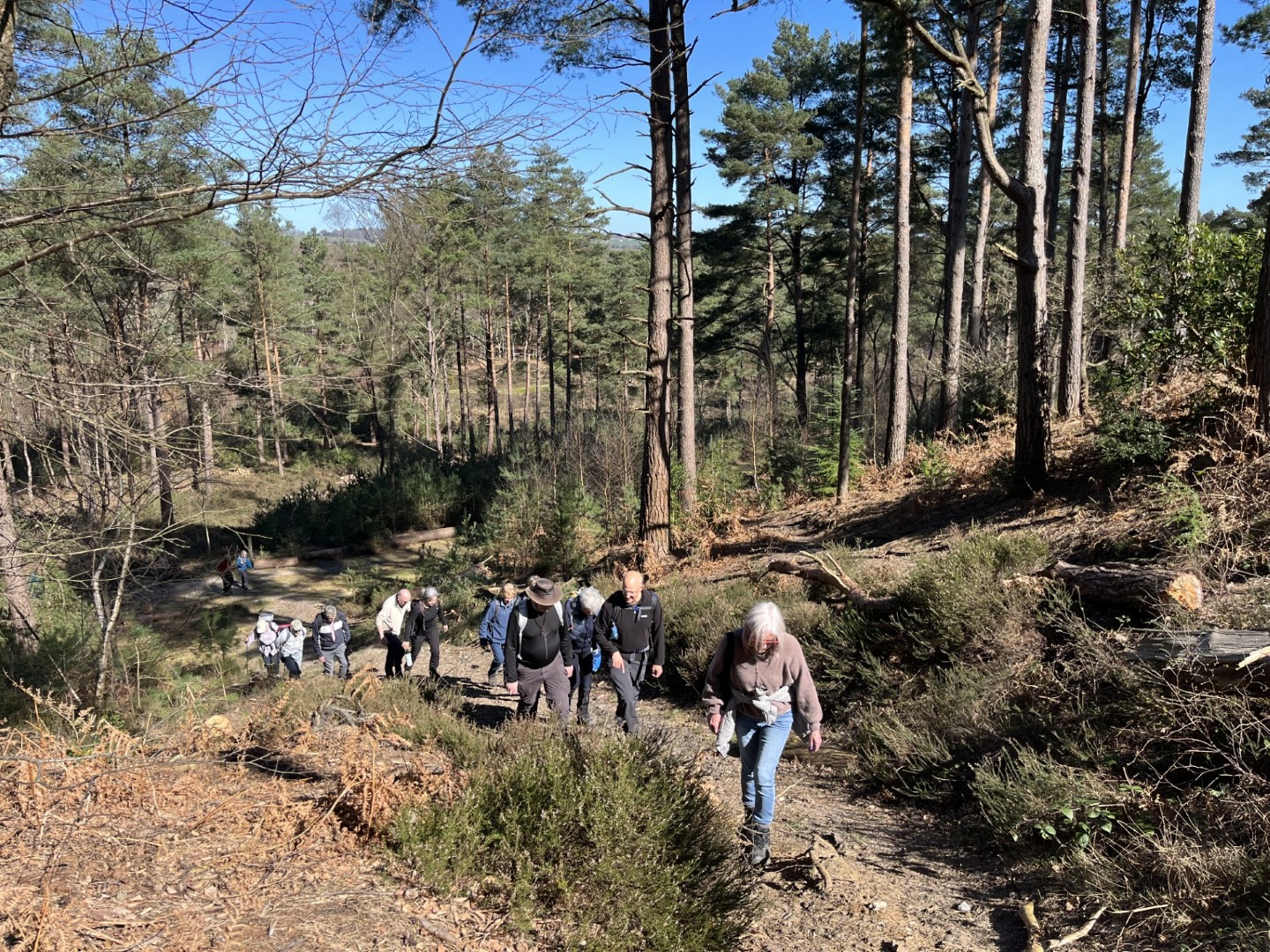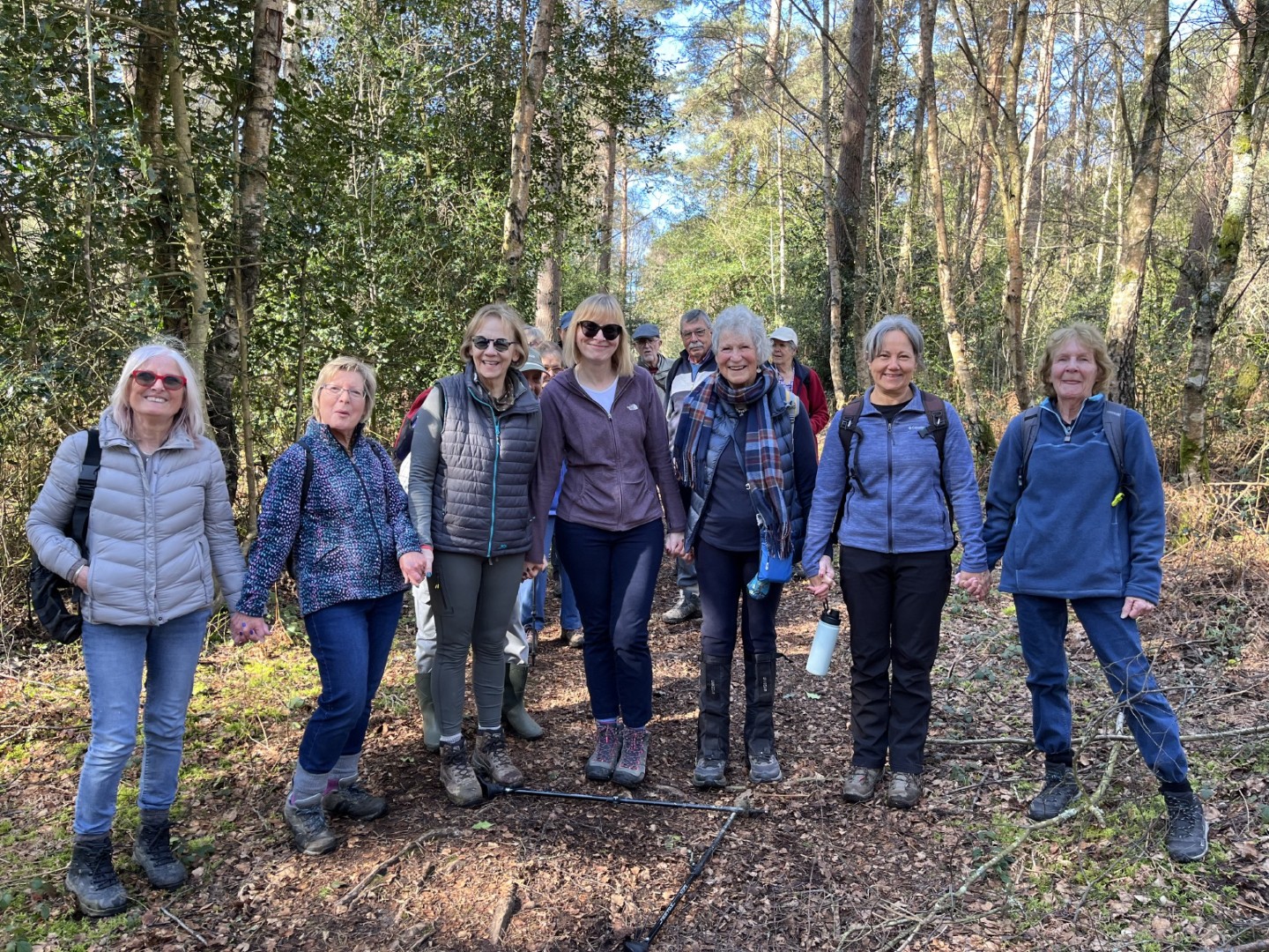 Sally and Robert enticed a good size group for their 4.2 mile walk in the balmy sunshine. We made our way from the National Trust Car park across Lavington Common onto Duncton Common through woodland and heath on the Serpent Trail. Leaving the trail to head north west on the footpath closer to the River Rother where the rainwater saturation of the soil over the past two months necessitated us making local diversions to keep our feet dry. Skirting fields we came to the track leading to Fitzlea Farm and the bridleway into Fitzlea Wood where we stopped for our coffee break. Crossing the Selham to Heath End road we continued the gentle climb onto Graffham Common with a steeper climb to reach the Serpent Trail again. On reaching Gallows Hill, we thought the miscreants probably had other things occupying their mind than the scenic views as we wandered past Bronze Age barrows (dating back to the period 2400-1500 BC), down the hill to the road at Barnett’s Bridge. Reaching Lavington Common, the path was very muddy until we got to the sandy elevated section and back to the car park. We drove around the corner to the Badgers pub for a lovely lunch.