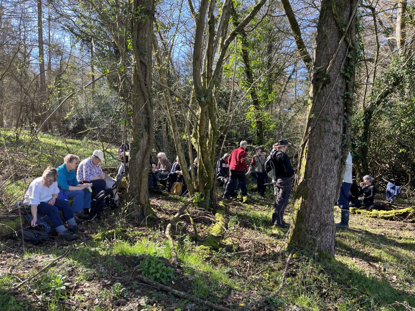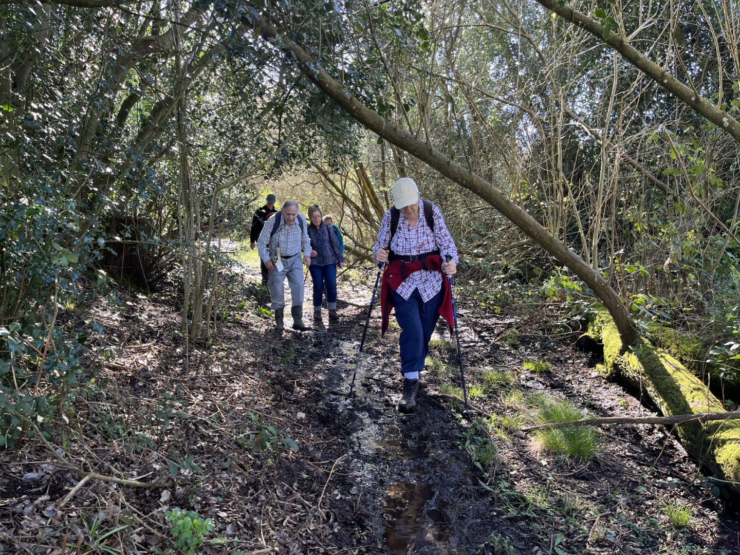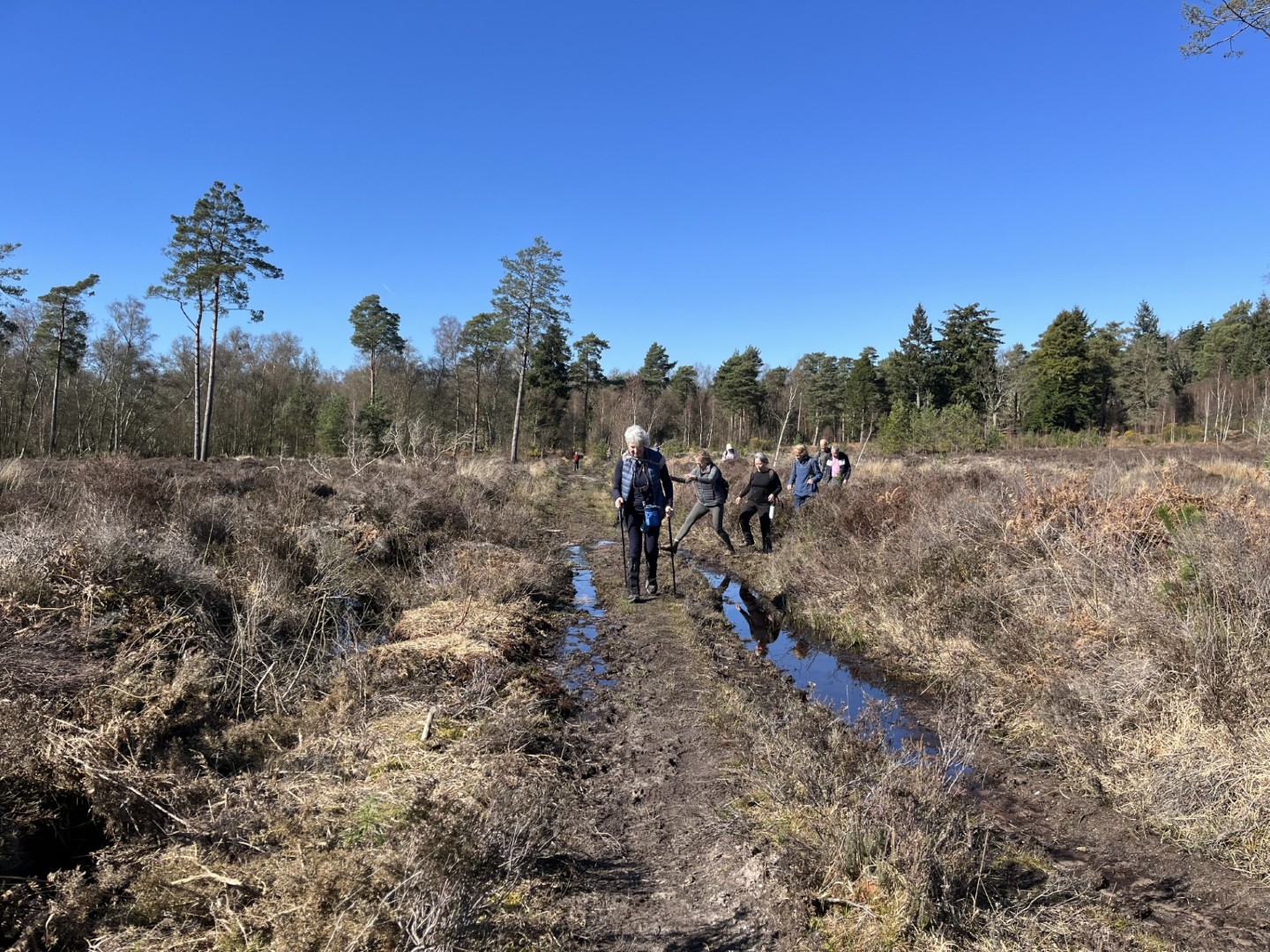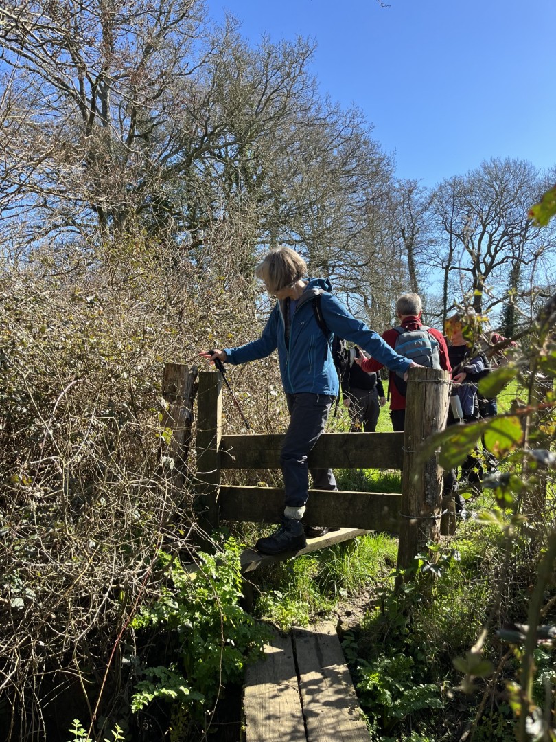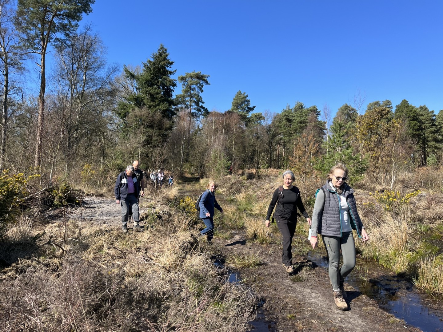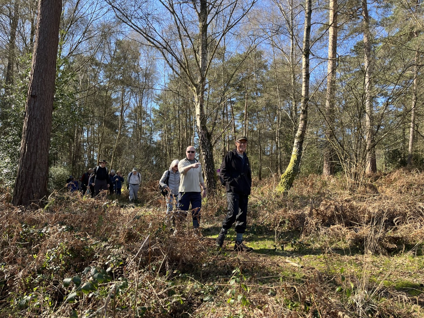 Sally and Robert enticed a good size group for their 4.2 mile walk in the balmy sunshine. We made our way from the National Trust Car park across Lavington Common onto Duncton Common through woodland and heath on the Serpent Trail. Leaving the trail to head north west on the footpath closer to the River Rother where the rainwater saturation of the soil over the past two months necessitated us making local diversions to keep our feet dry. Skirting fields we came to the track leading to Fitzlea Farm and the bridleway into Fitzlea Wood where we stopped for our coffee break. Crossing the Selham to Heath End road we continued the gentle climb onto Graffham Common with a steeper climb to reach the Serpent Trail again. On reaching Gallows Hill, we thought the miscreants probably had other things occupying their mind than the scenic views as we wandered past Bronze Age barrows (dating back to the period 2400-1500 BC), down the hill to the road at Barnett’s Bridge. Reaching Lavington Common, the path was very muddy until we got to the sandy elevated section and back to the car park. We drove around the corner to the Badgers pub for a lovely lunch.