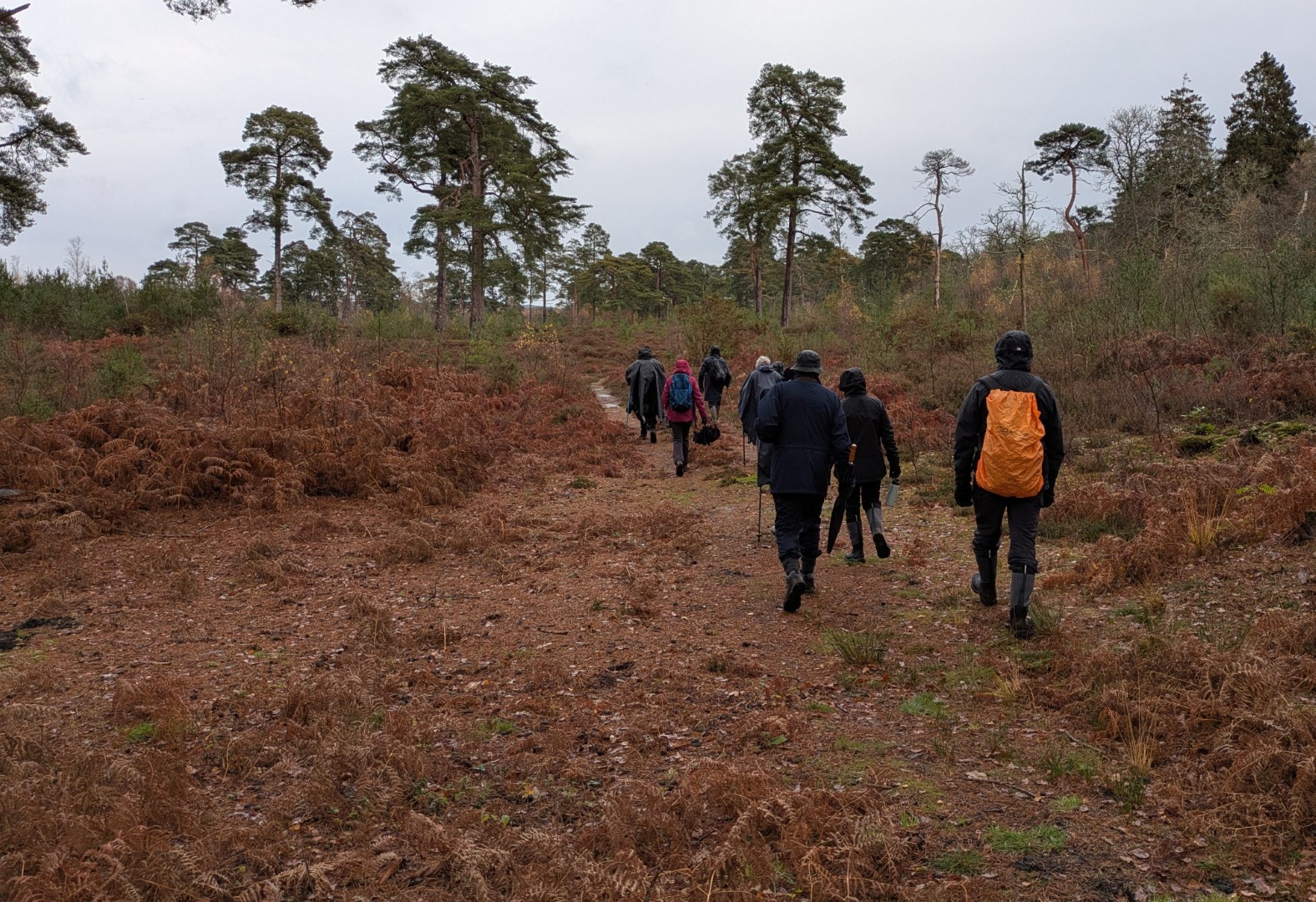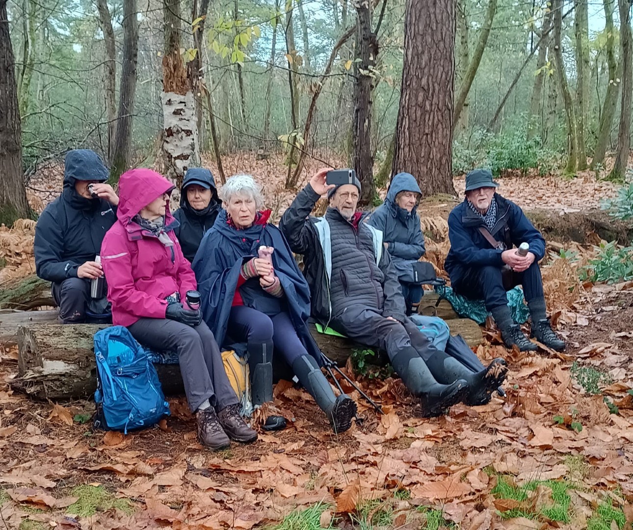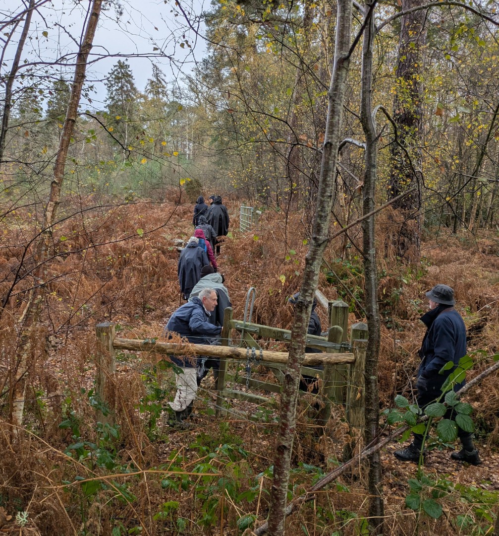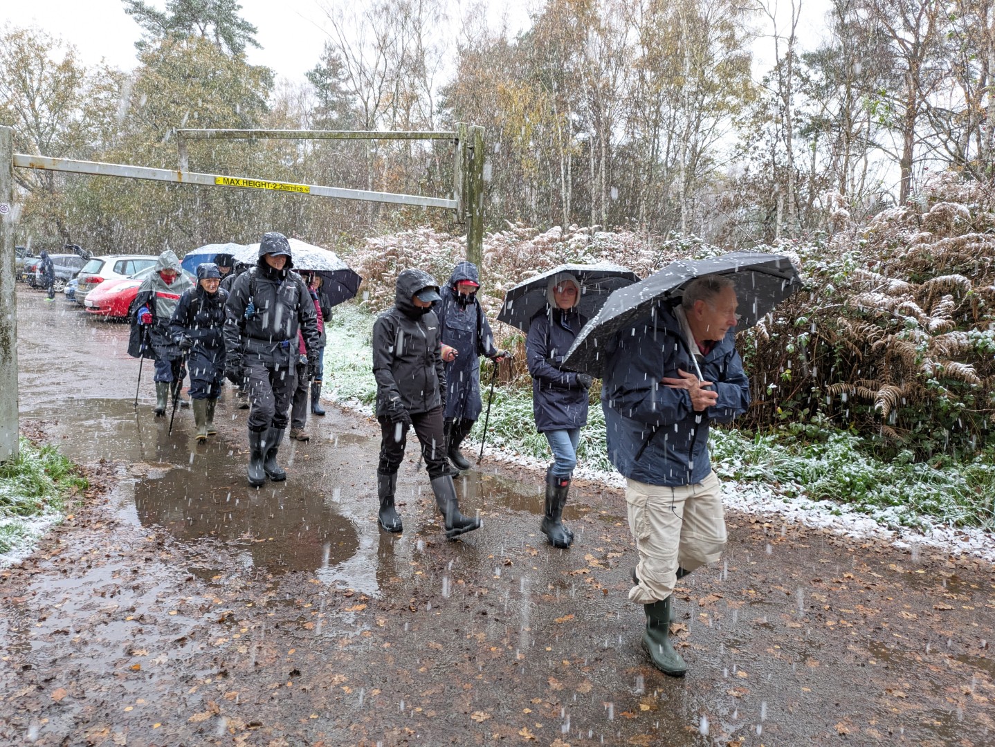 Arriving at Iping Common car park we huddled in our cars hoping that either the snow would stop or Isabel was going to change the walk to many, many circuits of the bar at the Hamilton Arms before lunch. However, after girding our loins, finding our umbrellas and dressing appropriately, we embarked on our walk. In the event the snow stopped in less than half an hour, so we had made the right decision, although it was replaced later by some rain. After taking the Serpent Trail over Stedham Common, we headed for Woolmer Bridge but then headed south for Quags Corner near Minsted - not to be confused with the Quags Corner near Horsham. Quag is an archaic term for a marsh or bog, but in spite of the earlier snow we found it reasonably easy walking. We then followed the fence shielding us from the extensive sandpit on Mitchells Common and eventually emerged at Fitzhill where we could see snow had settled on Harting Down. A field with a few horses in it showed no sign of snow but the horses looked cold and damp and disappointed we had no food for them! After crossing the Elsted road we soon found a suitable stopping point for a drinks break. Suitably refreshed, we skirted the edge of Trotton Common before eventually turning east and then reaching Iping Common and our parked cars. In spite of the weather we found the walk very rewarding. After a short drive to The Halmilton Arms anyone suffering from the cold weather soon warmed up and we all had some delicious Thai food from the extensive menu.