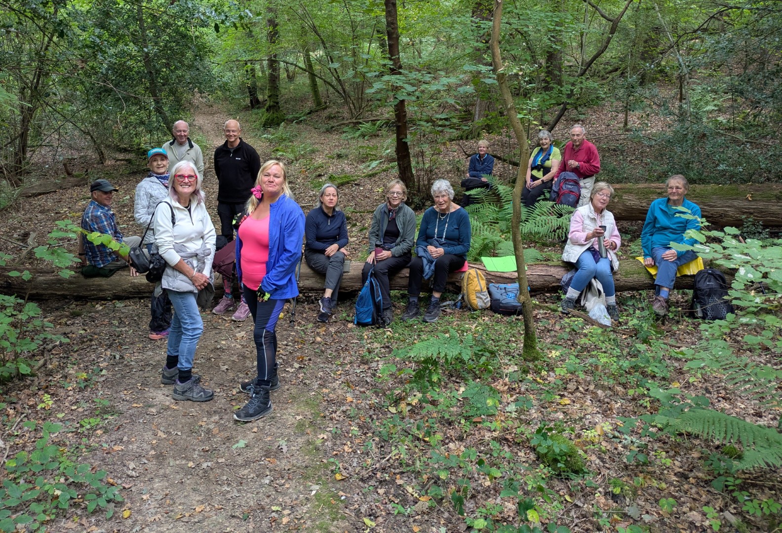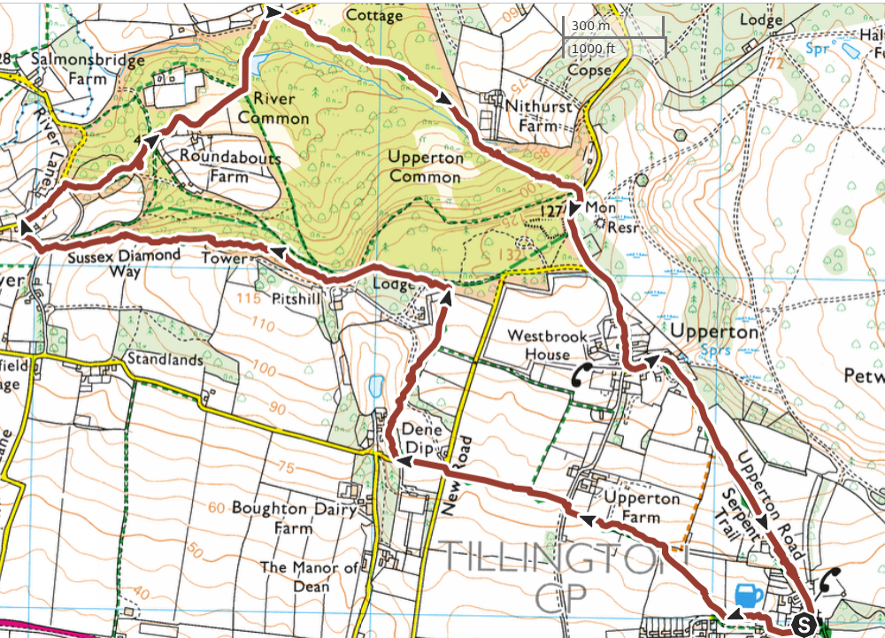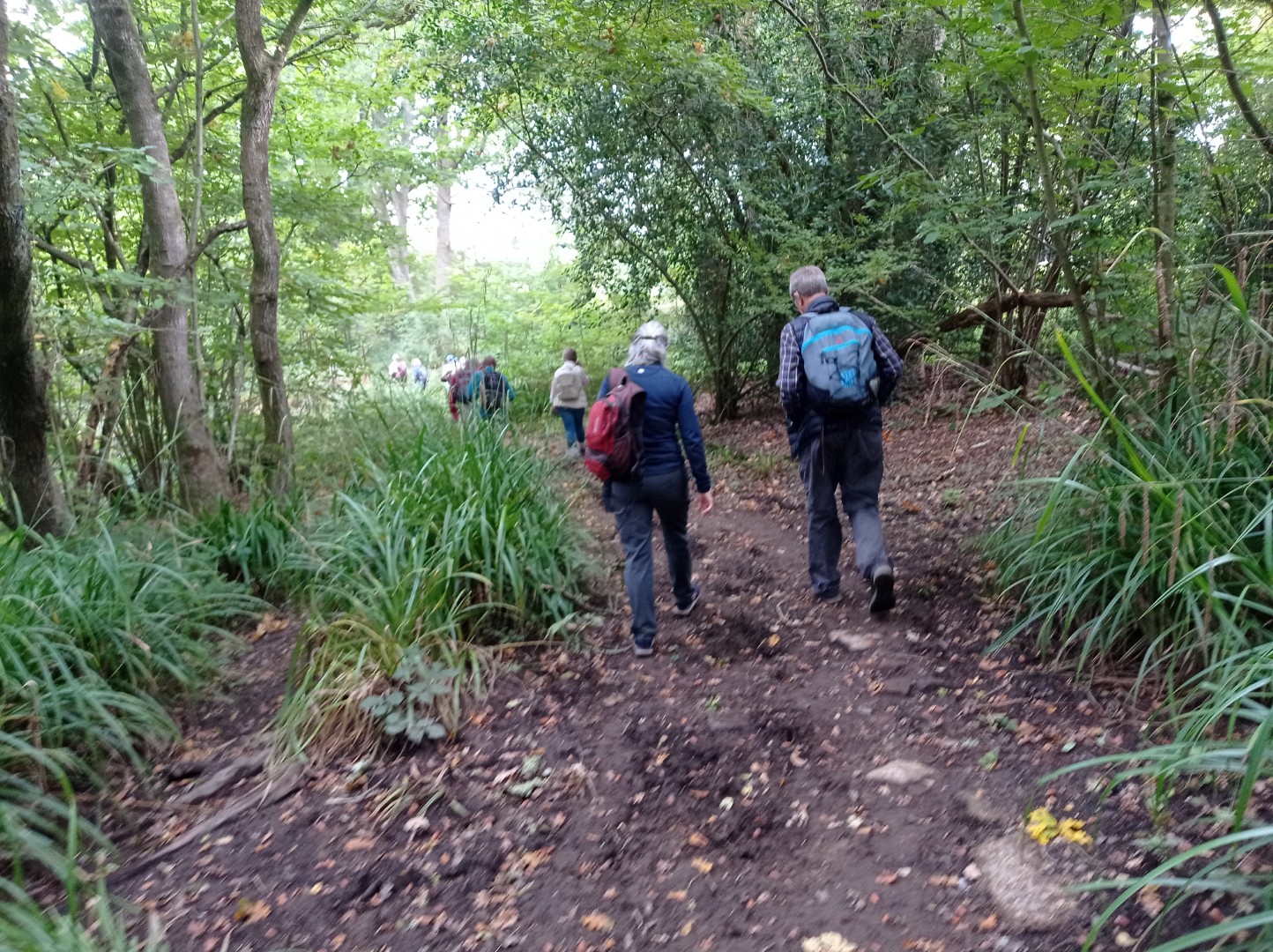 Carrying on with the Diamond Way we were soon treated to an excellent picnic stop with seats for all. Suitably refreshed we eventually came to the hamlet called River, from there walking through River Common and Upperton Common, picking up the Serpent Trail on the way. After a steep climb we emerged onto the road opposite The Folly in Petworth Park, probably built as a look-out in the late 18thC. The road took us down to Upperton village and eventually to our cars parked in Tillington. A short drive and we then stoppped for an excellent lunch in the Halfway Bridge.