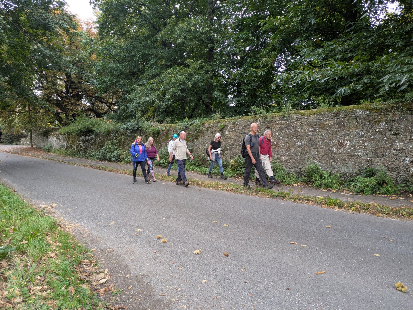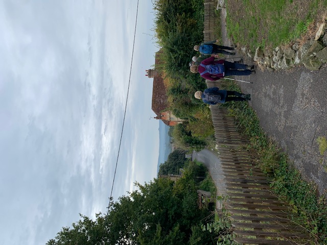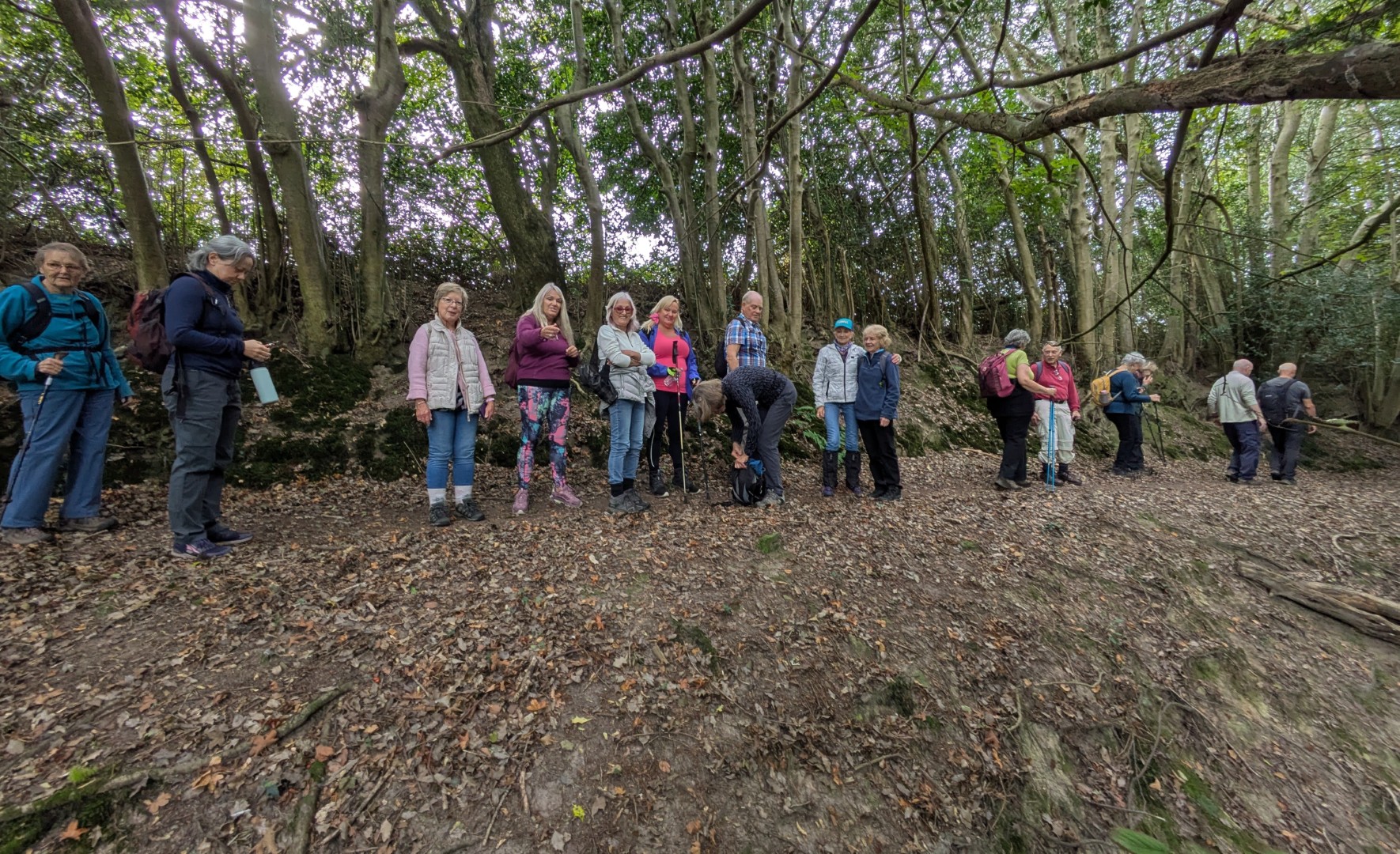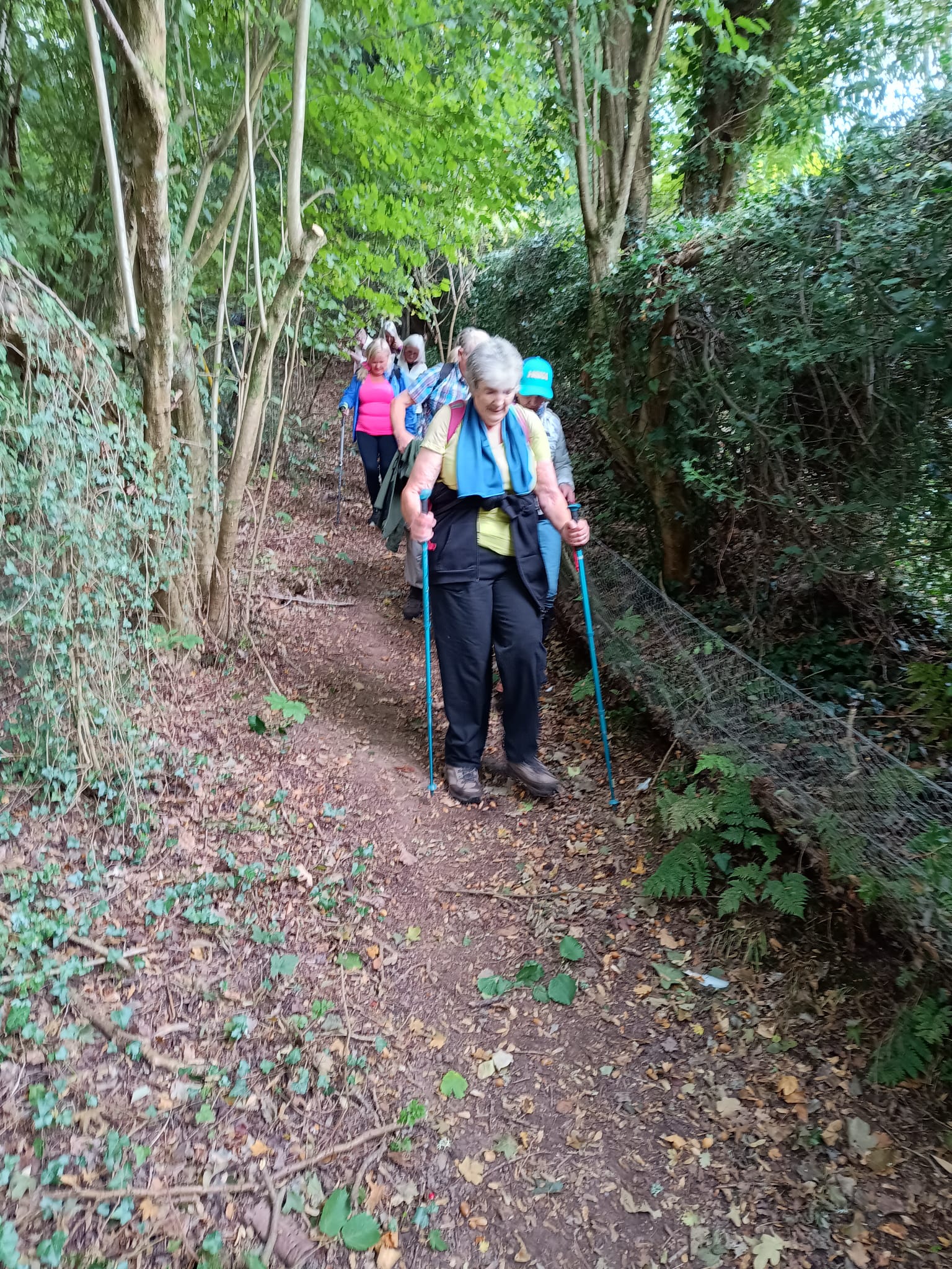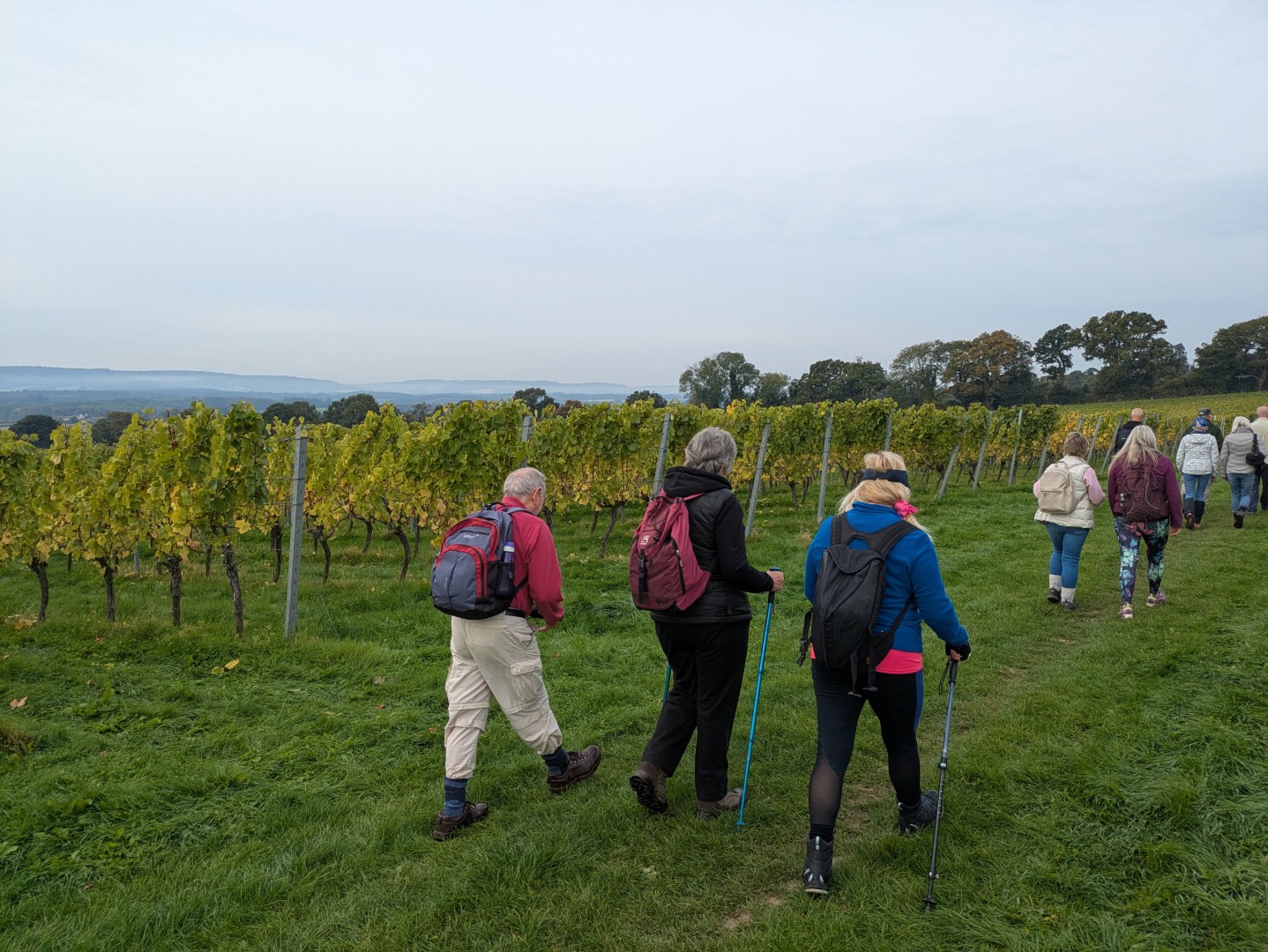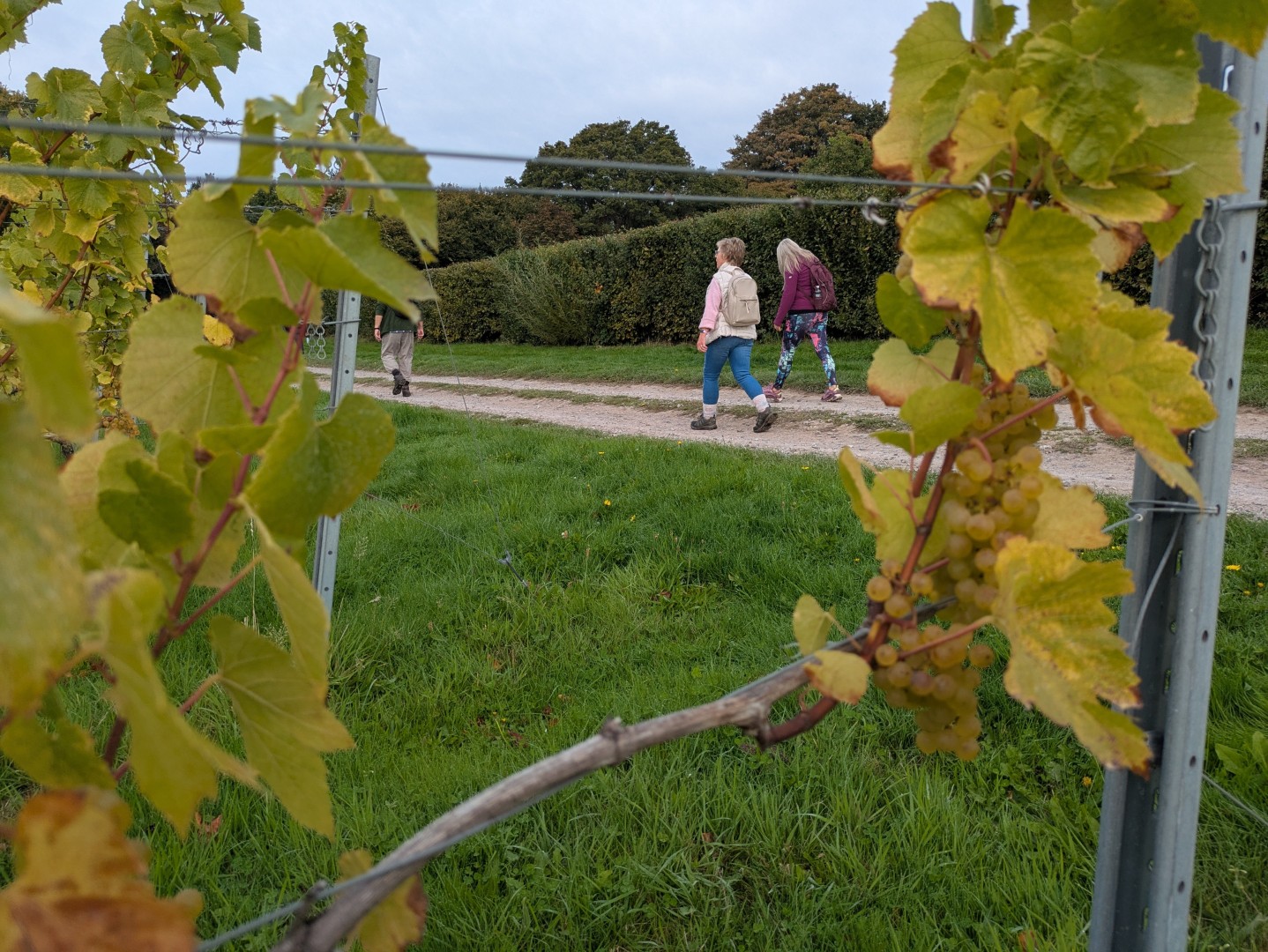 The walk led by Jay and Lindsey started from the road near the Tillington pub and headed south and east towards the cemetery. Not at all wishing to stop there, we headed north along the Sussex Diamond Way, passing through acres of vineyards, with grapes being harvested in the distance. We soon came to view the wonderful mansion called Pitshill. Building was complete by 1794 but the house was in poor condtion by 2010. After refurbishment, seven years later the building work was finished, including restoring the Shell House, a circular domed garden pleasure building allegedly decorated by the Mitford sisters, Frances, Emma and Caroline. The other sisters had remarkably political lives (Diana married Sir Oswald Mosley, Jessica, a communist who moved ot the U.S) so perhaps the shell decoration helped calm them down. See here :- Mitford family