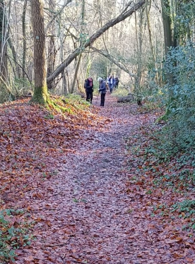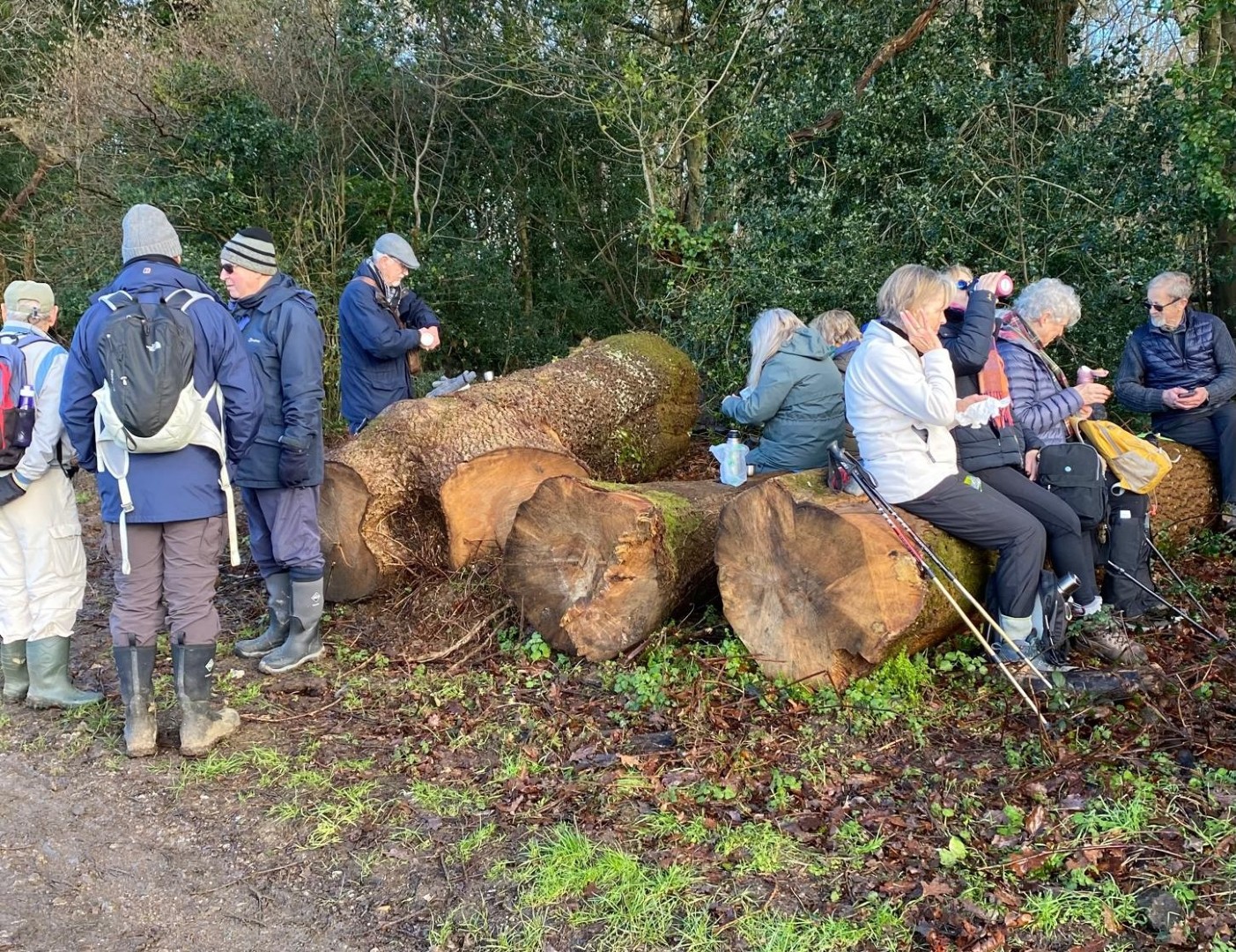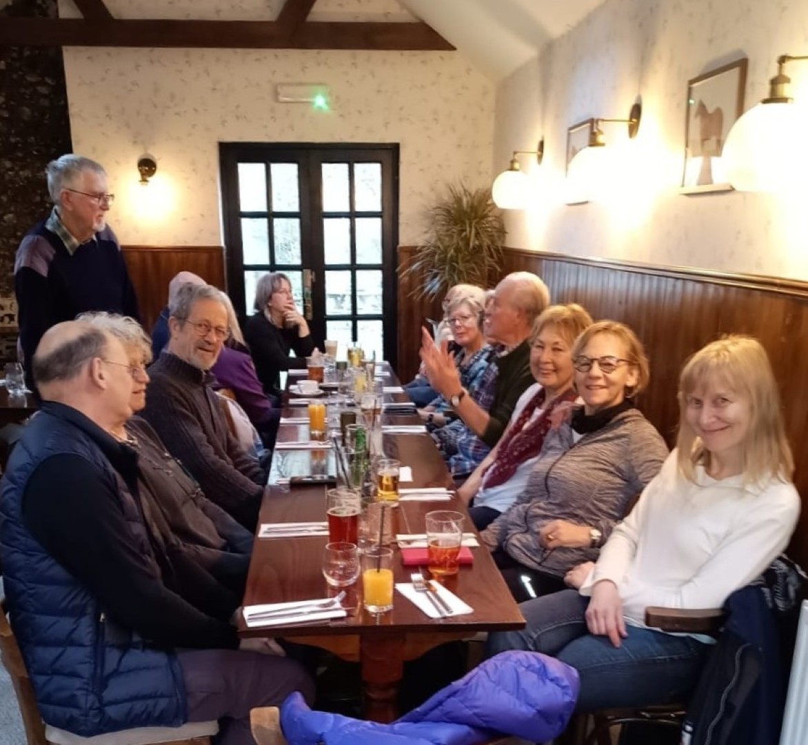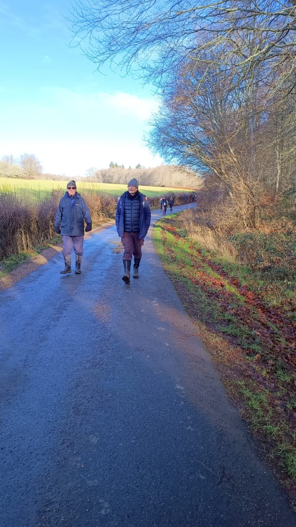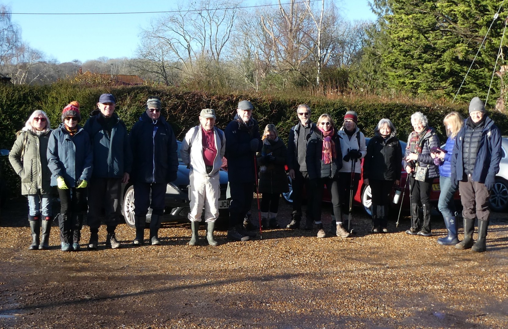 Even with a frosty start there were a good number of eager walkers gathered at the Barley Mow in Walderton for John's 5 mile walk. We were promised a steep climb but had to first pass Watergate. Watergate Park has nothing to do with Richard Nixon or even Watergate Forest near Gateshead - the house is just a rebuild from the latter part of the last century. However the name actually dates back to the 13th Century. The steep climb came shortly afterwards as we had to ascend Watergate Hanger, however we all made it without incident, emerging at the top in bright sunshine. After passing Broadreed Farm we found the ideal spot for a drinks break adjacent to Oak Copse, the Copse having donated a large number of suitable seats. Suitably refreshed we skirted past Lumley Wood before taking a turn east onto the Monarchs Way. This route was an excellent choice as it led us back to The Barley Mow and all the hills were downwards. The new licensees looked after us very well, especially as we had all seemed to have chosen a different meal.