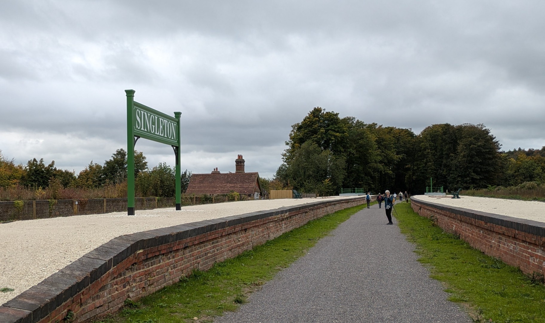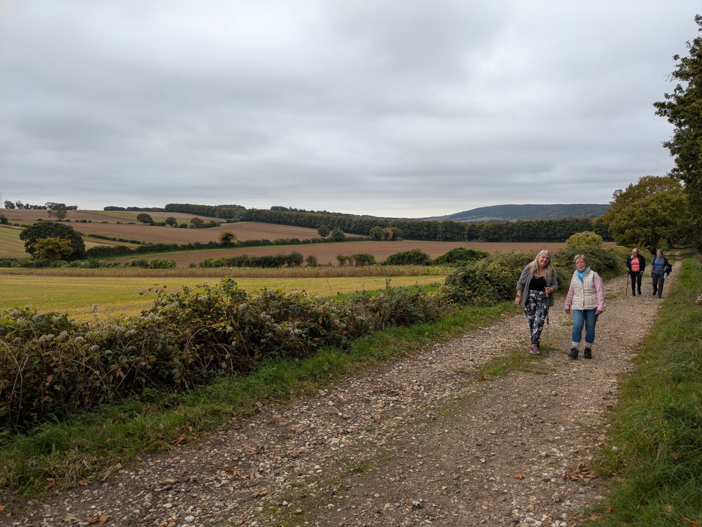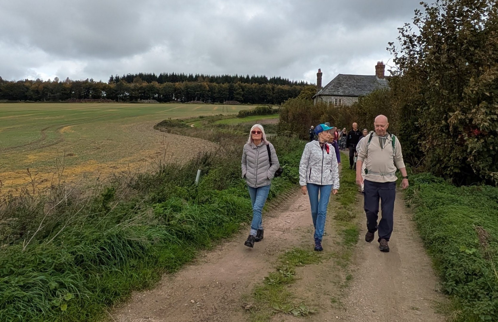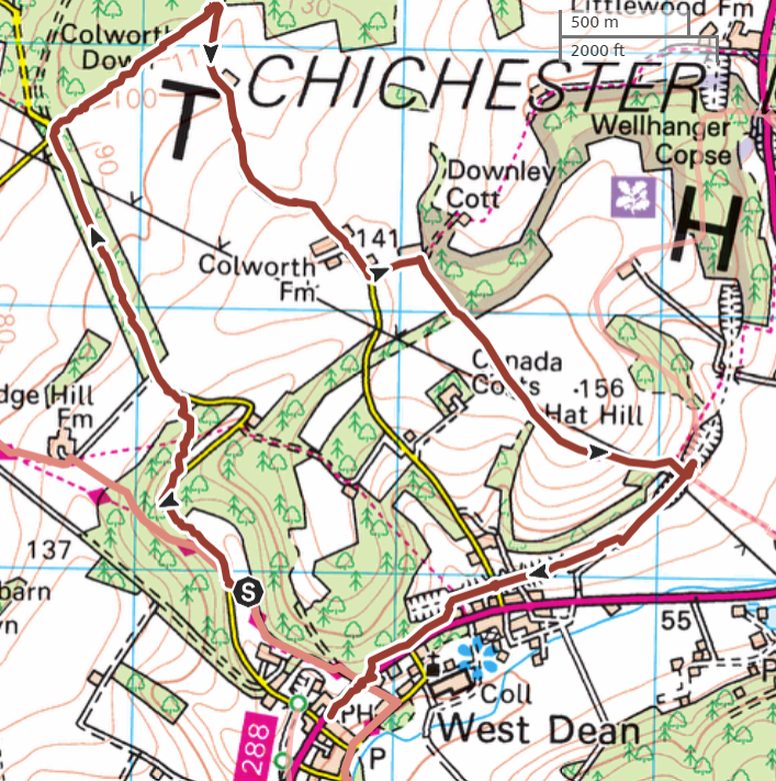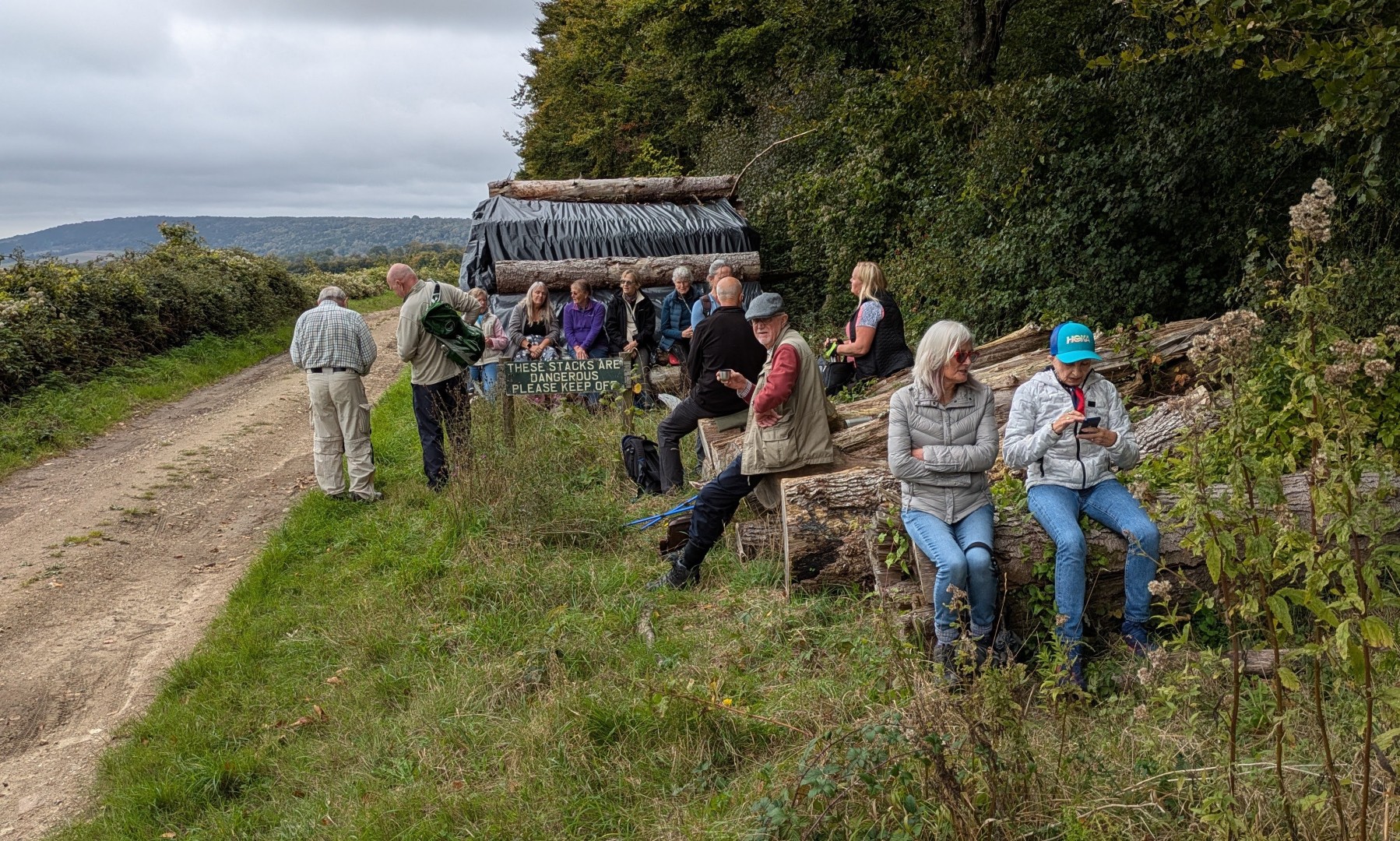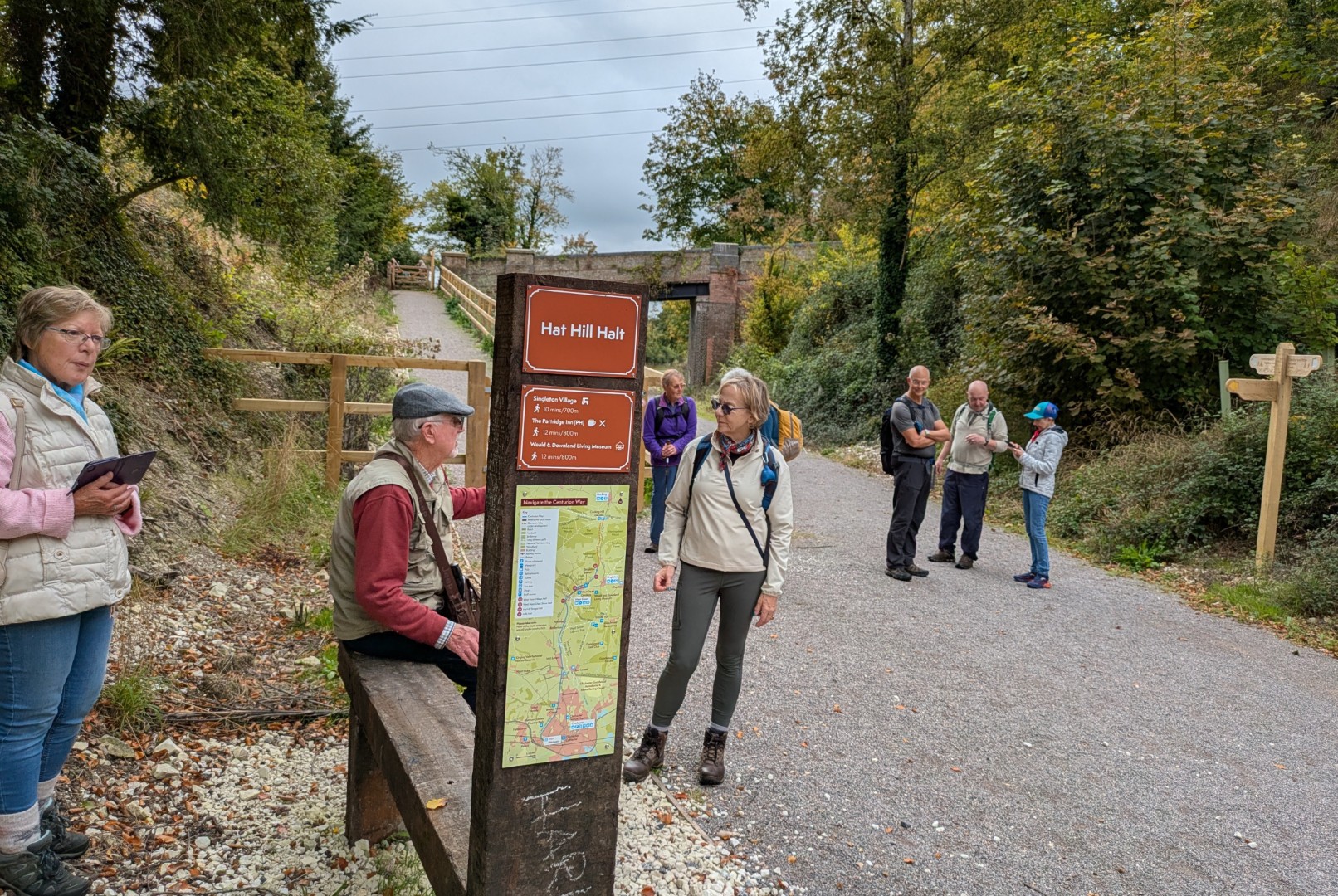 Having ordered our food in the Selsey Arms we set off on Mark and Jo's walk to find the Centurion Way and a few other places in between. We were warned of the long hill early on in the walk but we all survived the climb up through Whitedown Plantation before emerging onto the road near Lodge Hill Farm. There is a large chalkball in the hedgerow at this point and it turns out this is one of 15 placed between West Dean Gardens and Cocking Hill by the artist Andy Goldsworthy in 2002, to act as waymarkers. They were only expected to last a couple of years but have proved very resilient. An easy walk along a quiet road brought us to a north-westerly track next to Colworth Down where we found what at first glance seemed an ideal picnic spot. It was a pity the warning sign seemed only to apply to folk heading in the other direction! Turning south we passed a lot of building work going on at Colworth Farm before taking a steep hill down to the route of the old Midhurst to Chichester Railway. This now forms part of the Centurion Way. Heading south west we found the site of the original Singleton Station which has been very well restored. Taking the railway route towards Chichester was a good move as we soon found ourselves in the car park back at the Selsey Arms for a very enjoyable lunch.